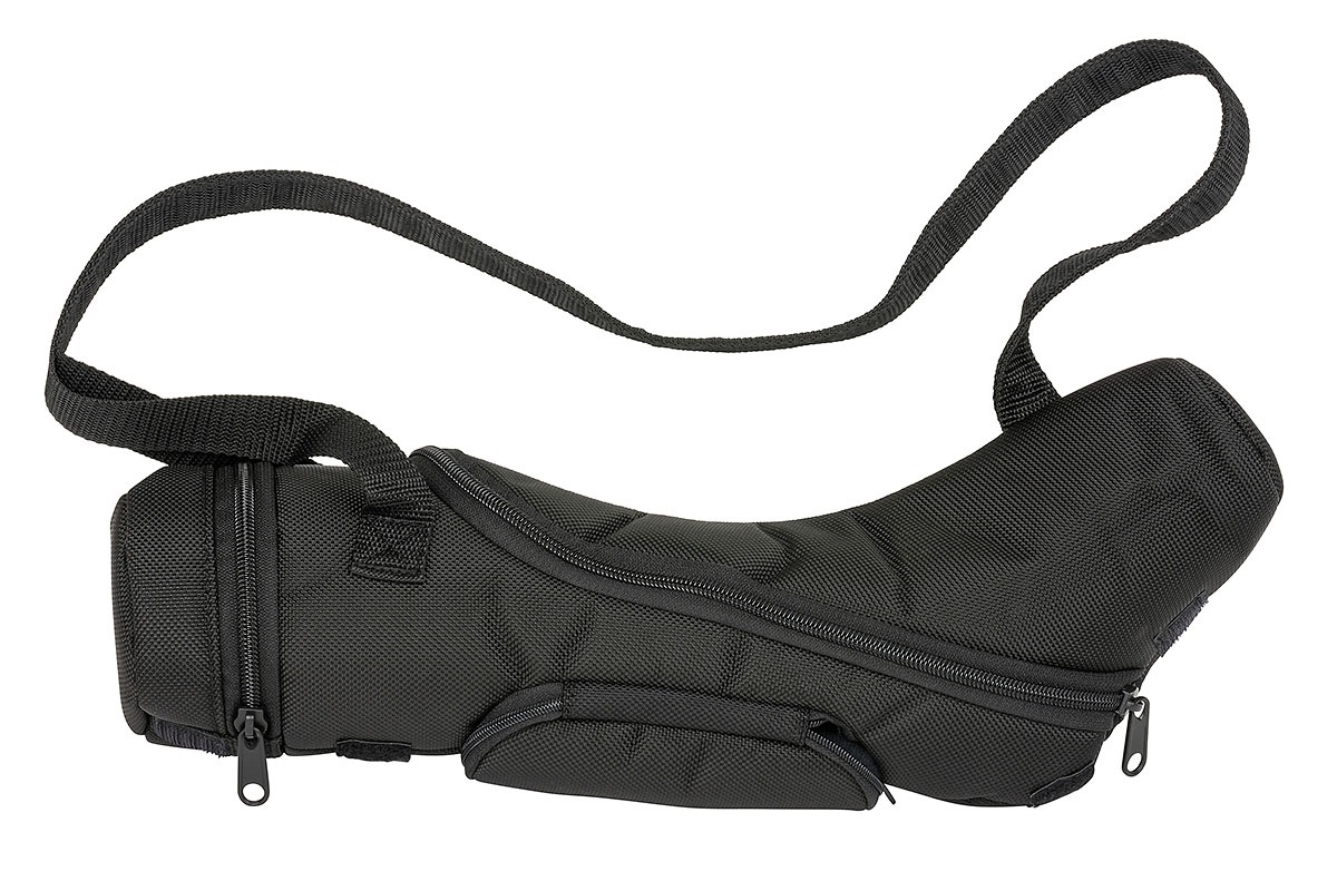 Edessä sekä okulaarin ympärillä olevat vetoketjulliset aukot mahdollistavat katselun ilman, että kaukoputken tarvitsee ottaa laukusta pois.