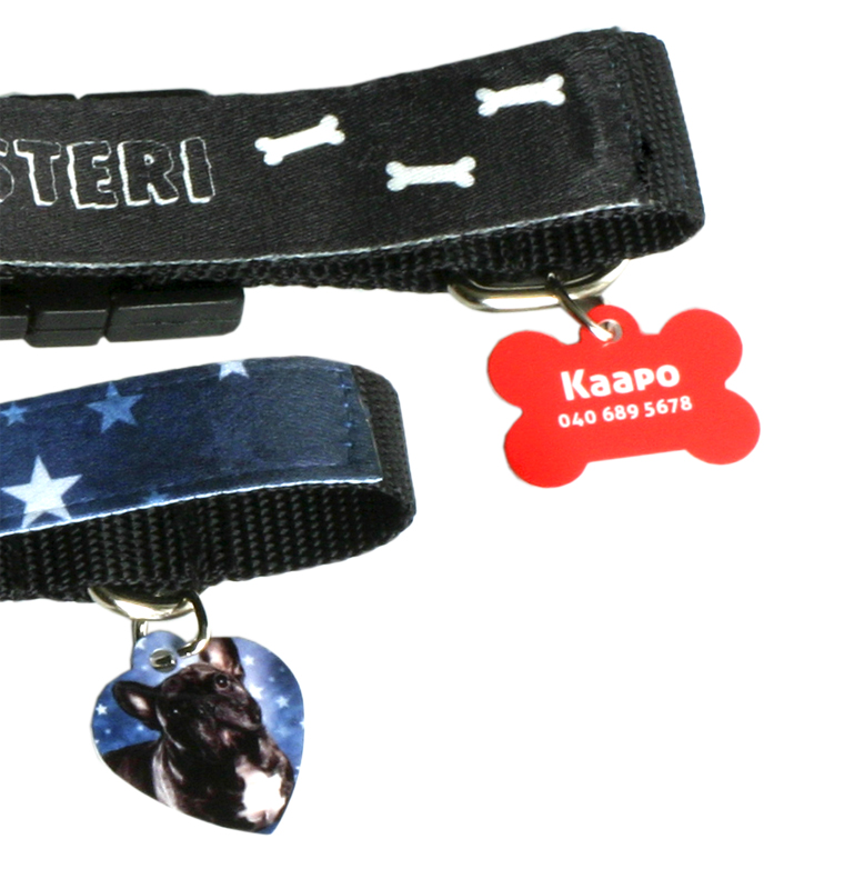 Alumiinimerkki koiranpantaan tai avaimenperäksi Kolme mallia Mukana avainrengas Sydämen muotoinen Mitat 32 x 35 mm