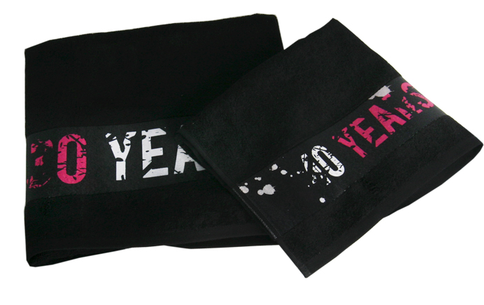 Pehmeä musta 400 g/m² puuvillapyyhe painatuksella. Pyyhkeen koko 50 x 100. Pyyhkeen reunassa painettu polyesterinauha.