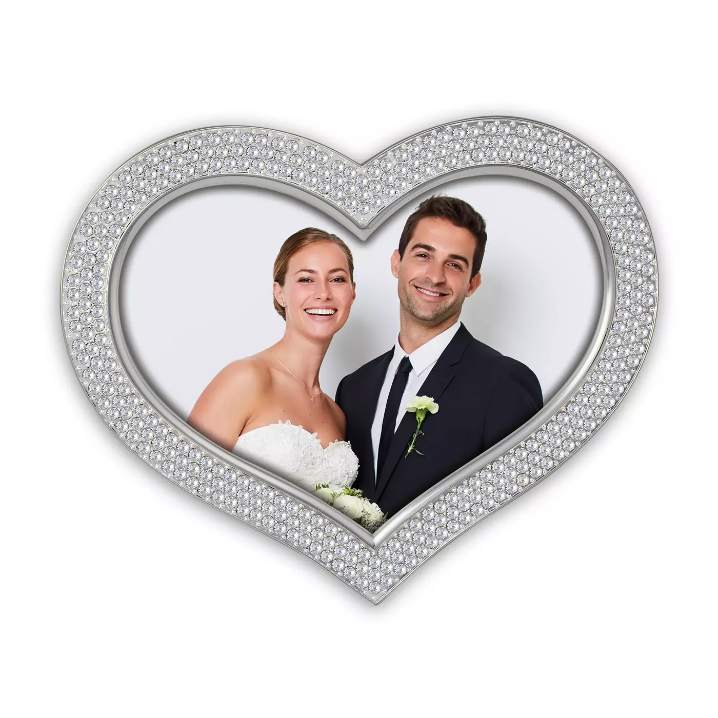 Tyylikäs, lasitimantein koristeltu sydämenmuotoinen metallikehys.