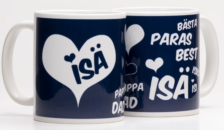ISÄLLE oma muki - valmiiksi painettu - myy sellaisenaan HETI mukaan otettavaksi Konepesun kestävä TEKNISET TIEDOT: n. Ø 80 mm, korkeus 96 mm