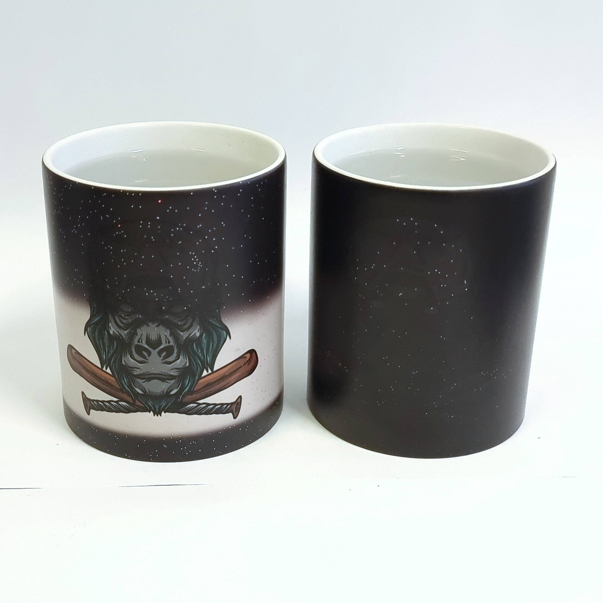 Keraaminen muki, joka muuttuu lämmönvaikutuksesta mustasta "valkoiseksi".
