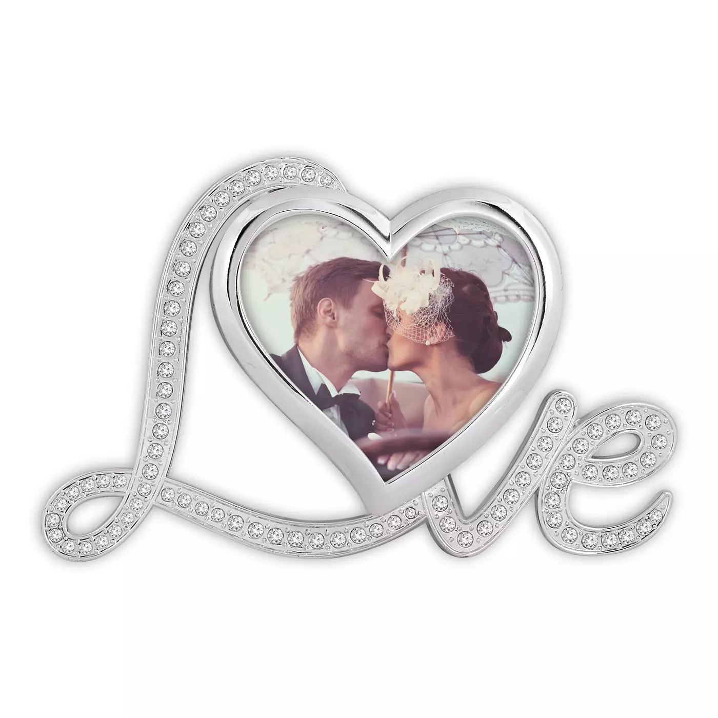 Margot metallikehys kiiltävällä viimeistely. Sydämen muotoinen, koristeltu profiili lasitimaintein ja LOVE tekstillä.