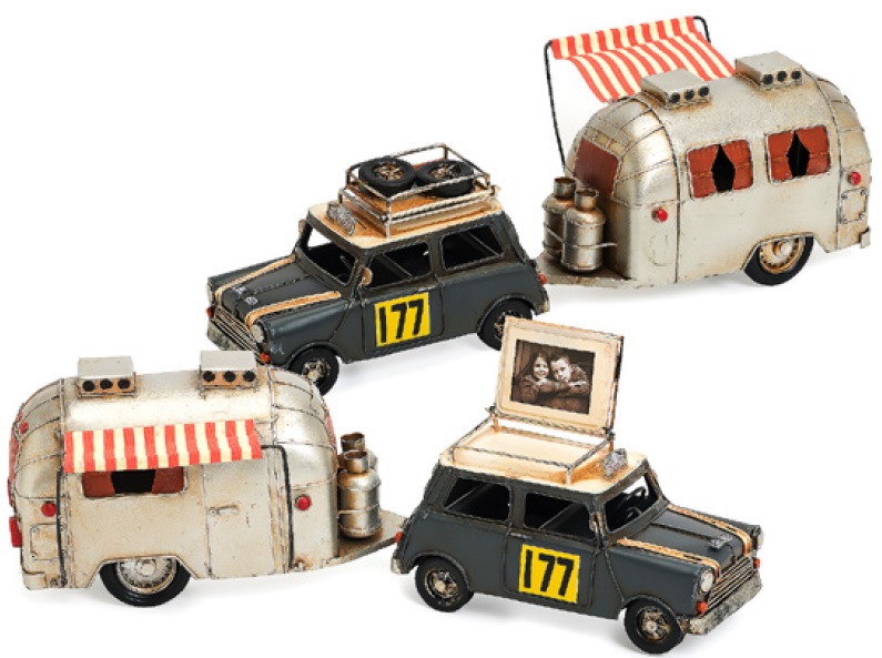 Karavaanarille upea metallinen minin näköinen auto hopean värisellä asuntovaunulla. - paikka valokuvalle Ulkomittaa n. 43 x 11 x 16 cm