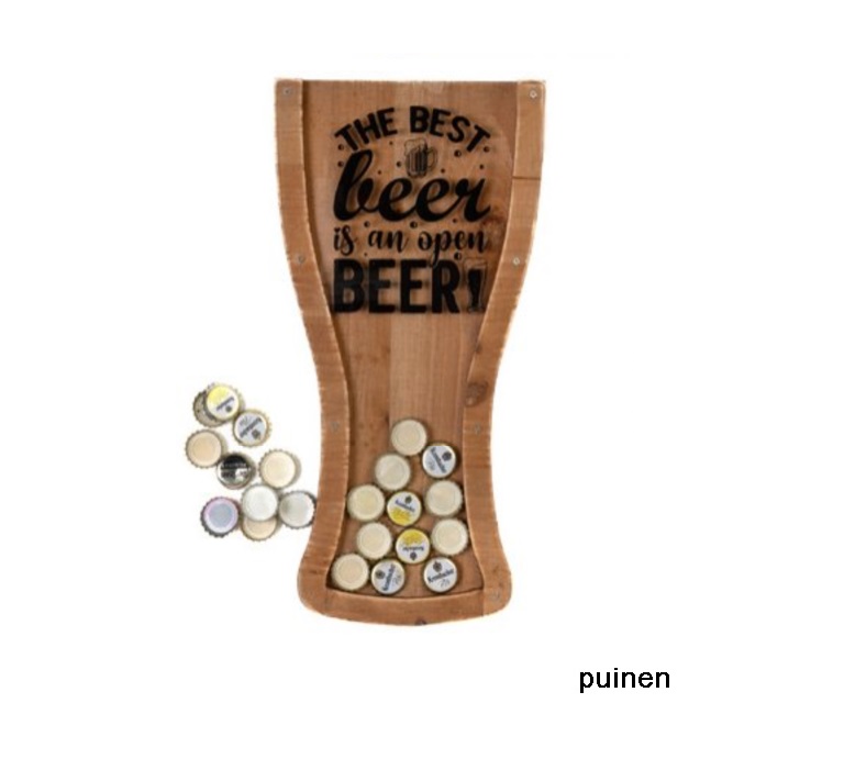 Lahjaidea oluen ystävälle. Puinen kapsyylikorkkien kerääjä. Kapsyylien sijan, puiseen tuoppiin voi myös kerätä kolikoita. Muovilasi jossa lukee "The Best beer is an open Beer!" Koko n. 40x20cm... Lue lisää