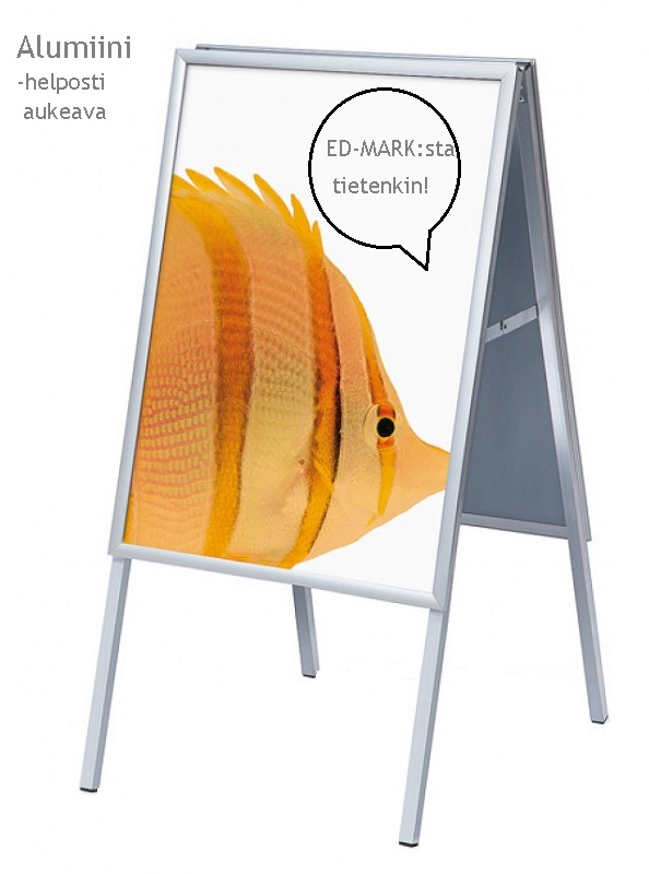 Tukeva Alumiinen A-teli sisä- ja ulkokäyttöön Helposti avattava Snap-mekanismi Julisteen koko 50x70 Alumiinirunko, terässaranat ja kiinnikkeet. Iskunkestävät ruostumattomat taustalevyt.... Lue lisää
