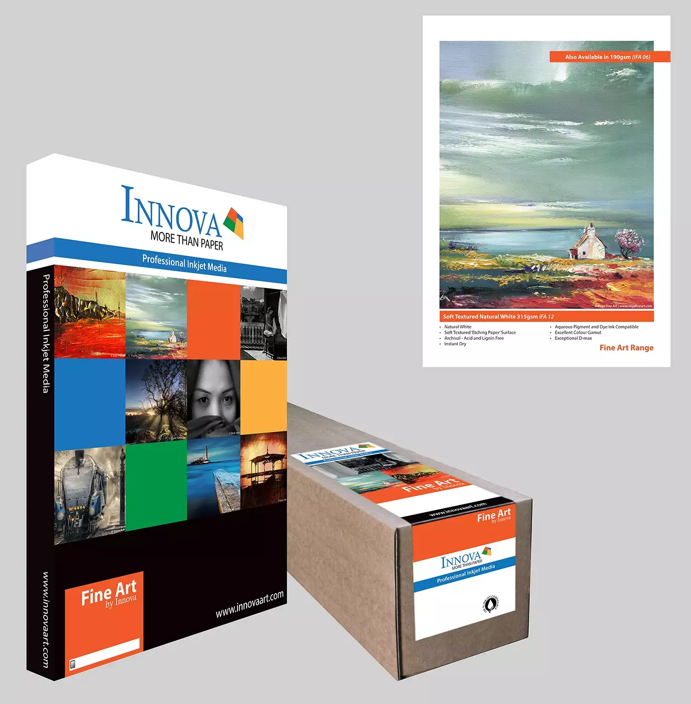 Tämä arkistopaperi on päällystetty samalla vesipigmentti- ja väriainesuihkutekniikalla, joka on yhteensopiva Innova Fine Art -valikoiman muiden