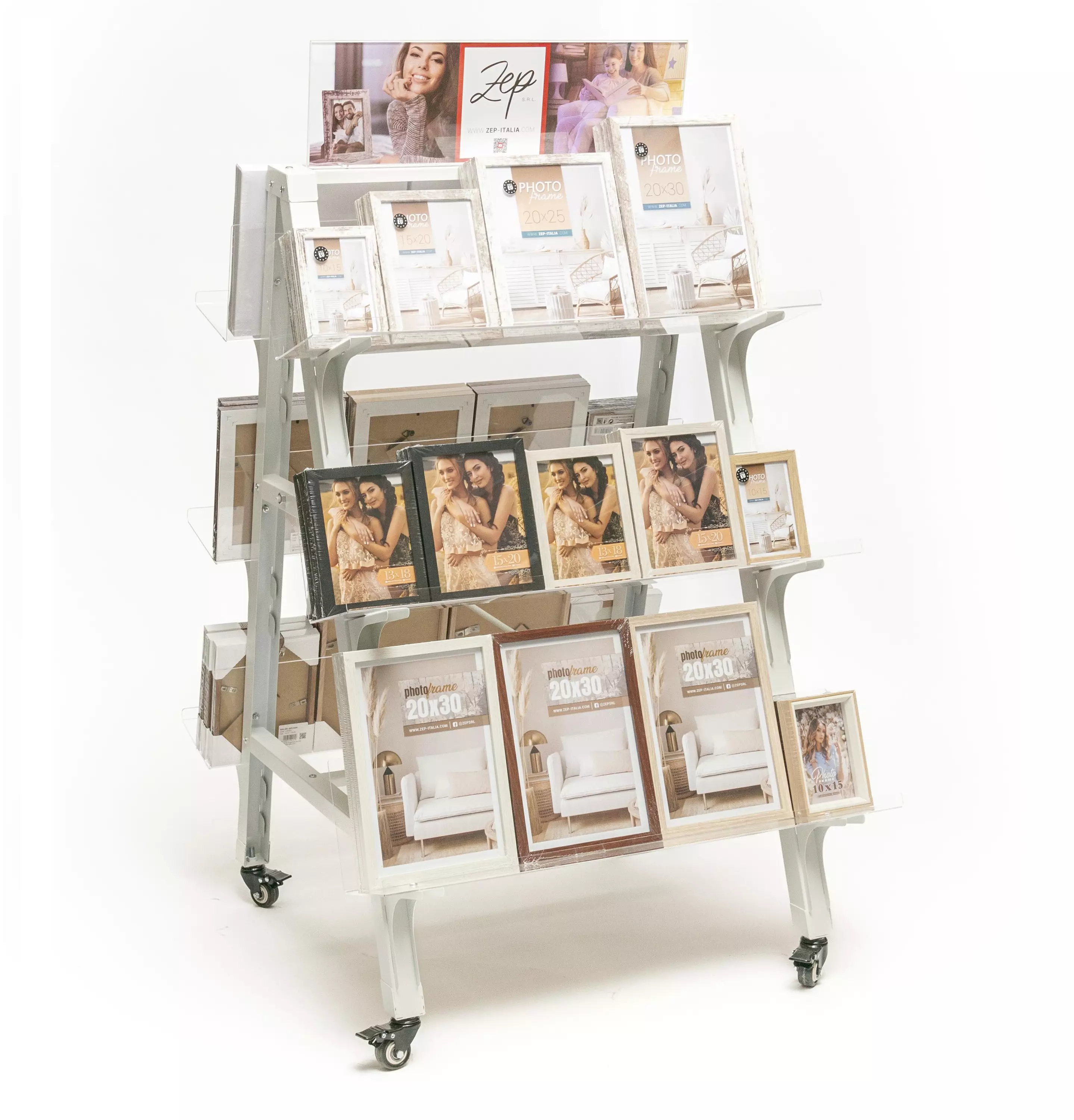 Kätevä, helposti siirettävä teline esim. kehysten ja albumeiden esillepanoon. Akryylihyllytasojen ansiota hyllyt eivät varjosta, vaan tekevät telineestä valoisan ja kevyen. Tuotteet näkyvät... Lue lisää