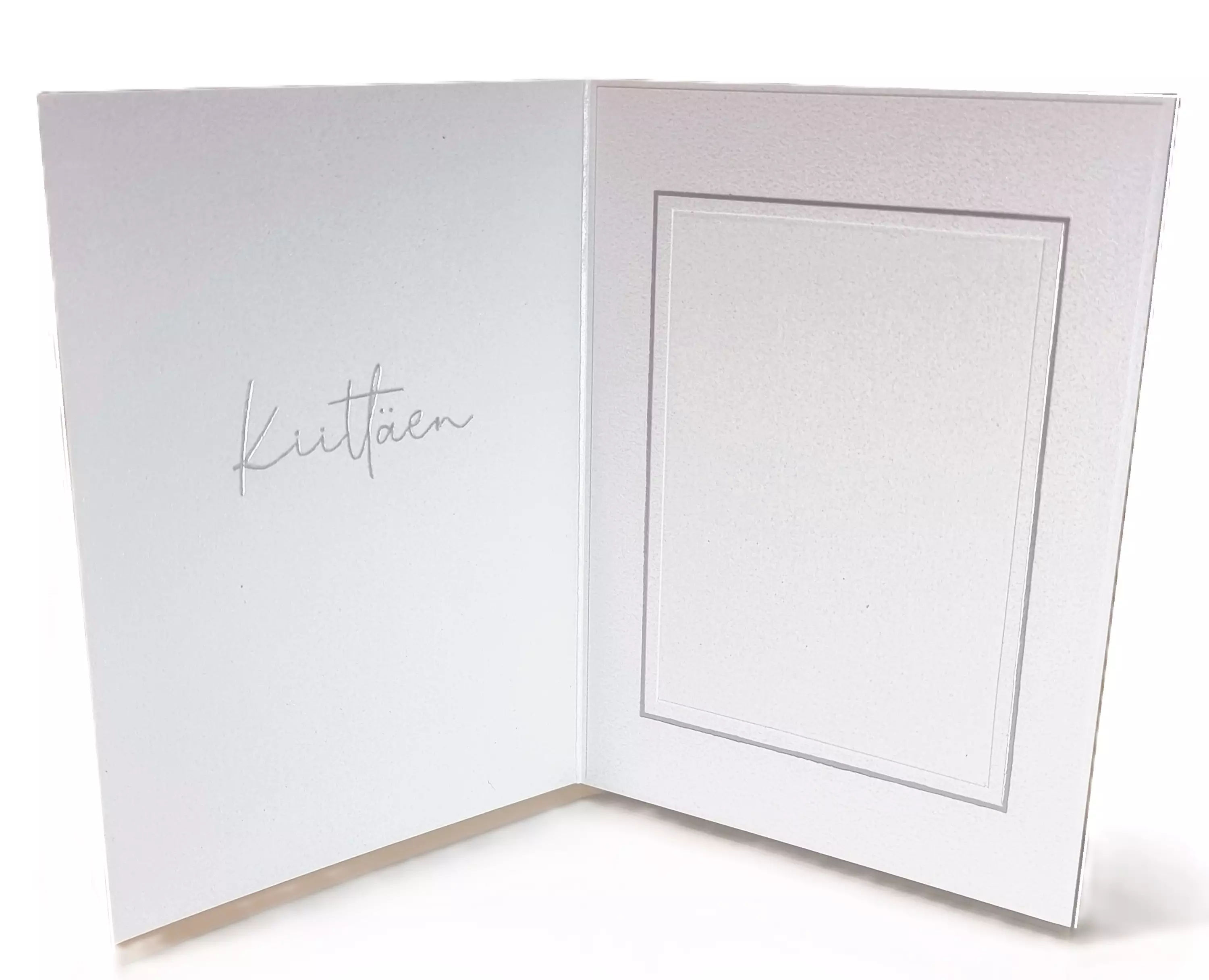 Modernilla tekstityylillä Helmiäiskiitoskortti hopea foliolla - Kiittäen teksti sisäkannessa - Kuva-aukko 65x95mm / 7x10 kuvalle Pakkauskoko 100 kpl. Mukana kirjekuoret