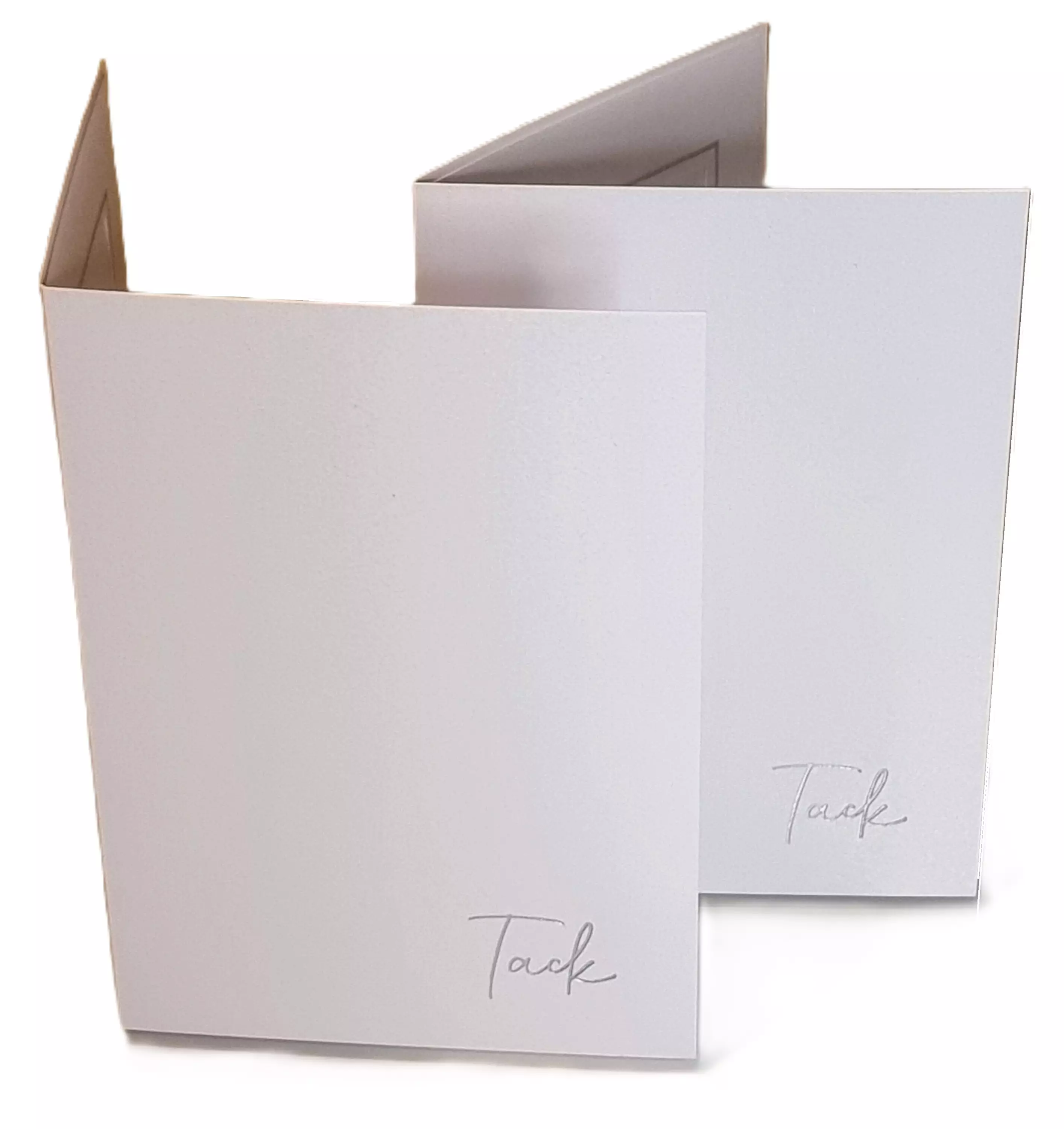 Modernilla tekstityylillä Helmiäiskiitoskortti hopea foliolla - TACK teksti sisäkannessa - Kuva-aukko 65x95mm / 7x10 kuvalle Pakkauskoko 100 kpl. Mukana kirjekuoret HUOM: teksti on oikeasti... Lue lisää