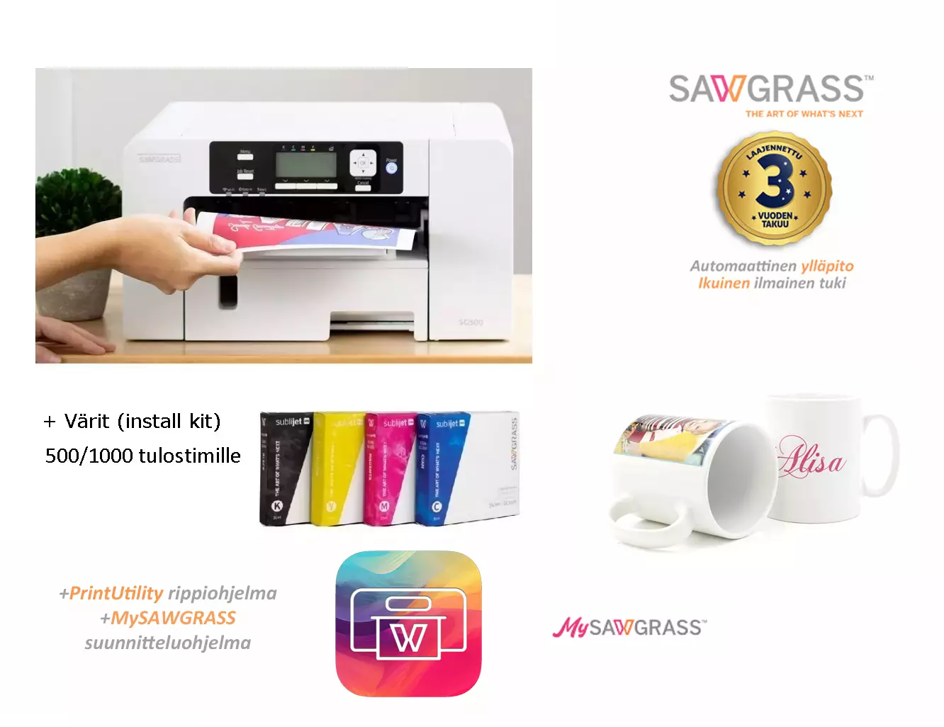 TULOSTIMEN ASENNUS (ohje + video): https://care.sawgrassink.com/hc/en-us/articles/10622386966299-Setting-up-Your-Printer