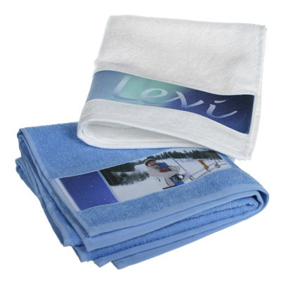 Pehmeä puuvillapyyhe, jossa painettava polyesterinauha