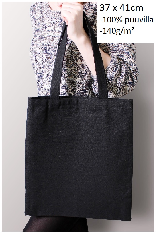 Väri musta / tumma. Materiaali: 100% puuvilla Paino: 140g/m² Koko: 41 x 37 cm Pitkät sangat n. 70cm Kysy tarjousta isommille erille.
