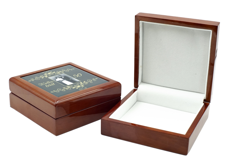 Näyttävä puinen koru-/säilytysrasia Sisällä valkoinen pehmeä kangas Kannessa painettava keraaminen laatta Laatan mitat 108 x 108 mm Rasian mitat 140 x 140 x 55 mm