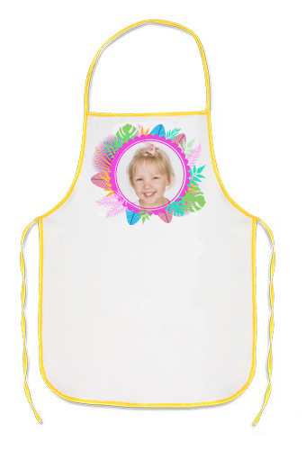 Valkoinen lasten esiliina esimerkiksi askarteluun, leipomiseen... Keltainen kanttinauha Mitat 45 x 55 cm