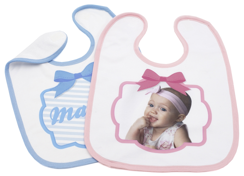 Ruokalappu tarrakiinnityksellä. Saatavana sinisellä, vaaleansinisellä, valkoisella ja vaaleansinisellä kanttinauhalla.