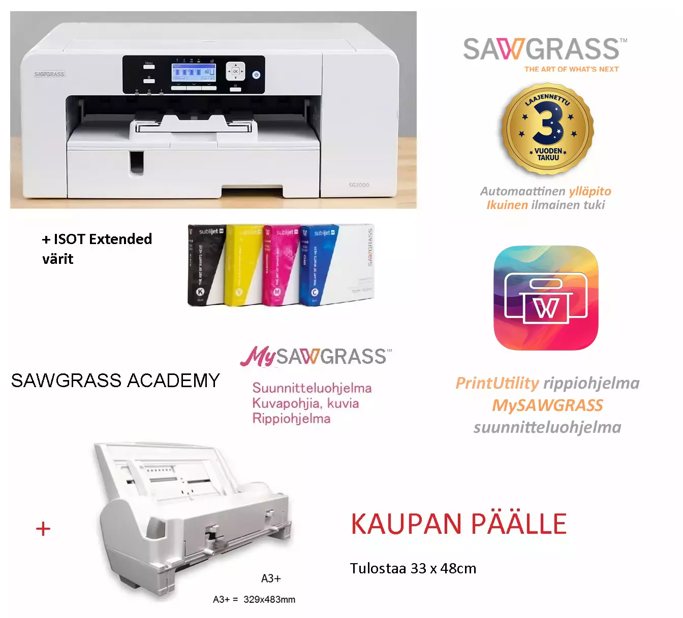 SG1000 SUBLIMAATIOTULOSTIN + ByPass laite -> tulosta A3+ 33x48cm kokoa (Multi-bypass laite toimitetaan jälkeenpäin) - Katso saldo SG1000 tulostimista! SAWGRASS SUBLIMAATIOTULOSTIN - varmatoiminen -... Lue lisää