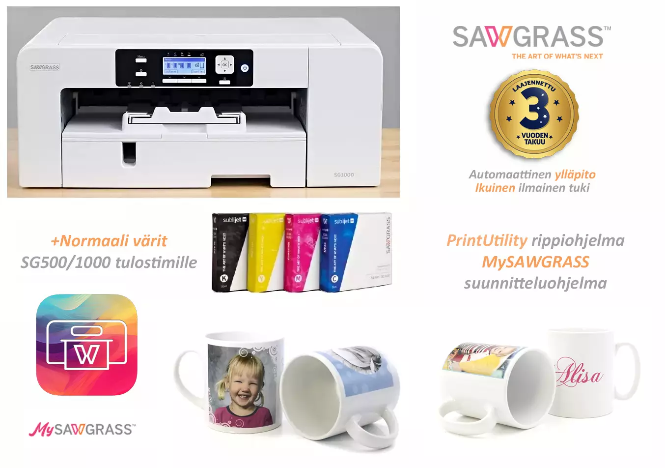 TULOSTIMEN ASENNUS (ohje + video): https://care.sawgrassink.com/hc/en-us/articles/10622386966299-Setting-up-Your-Printer