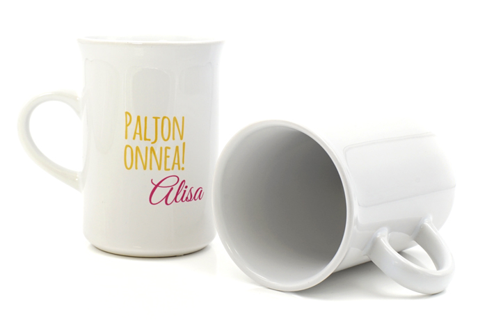Keraaminen valkoinen muki kaarevalla yläreunalla Konepestävä Ø 67 mm / 78mm, korkeus 107 mm Tilavuus n. 270ml Paino 290 g Painoala 82 x 180 mm 36 kpl/ltk HUOM: tälle mukille tarvitaan pienempi... Lue lisää