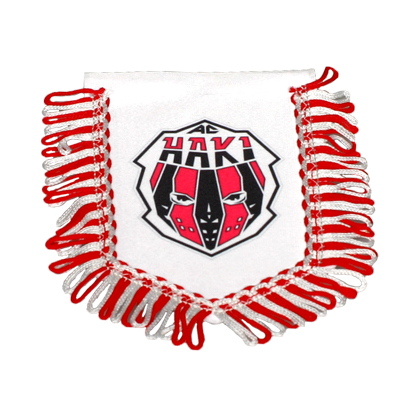 Viisikulmainen viiri satiiisella kankaalla Sisällä kartonkivahvike Kolme kokoa ja kolme väriä Mukana naru ja puinen rima Mitat 280 x 220 mm Puna-valkoiset hapsut