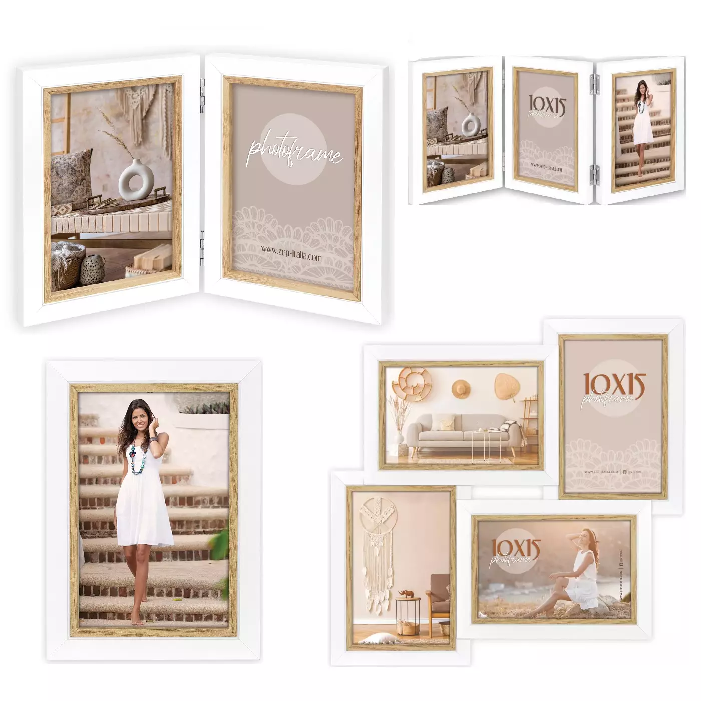 Useita kokoja: 10x15, 13x18, 15x20; saranakehyksiä, monikuvakehyksiä