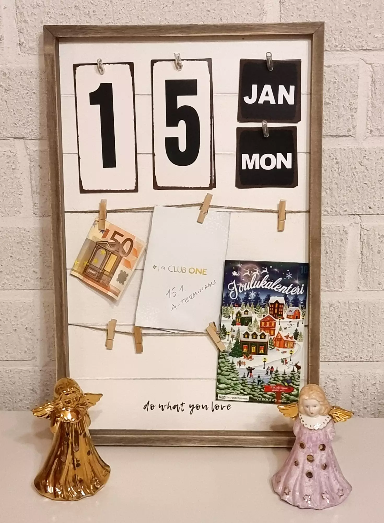 Puinen kehys, jossa on kalenteri sekä ripustusnarut kuville ja muistilapuille.
