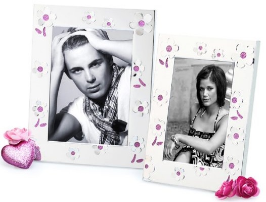Hopean värinen metallikehys jossa lilan väriset kukka-aplikaatiot.