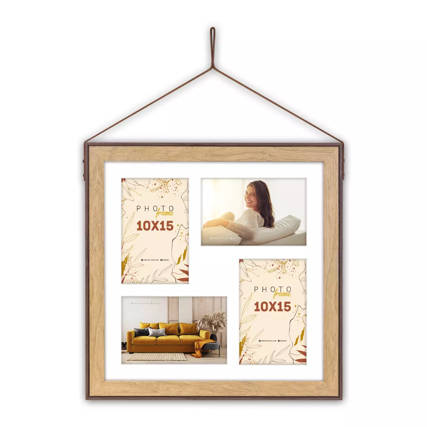 Kaksivärinen Lugo monikuvakehys 4:lle 10x15 kuvalle. Luonnopuun ja ruskean värisessä kehyksessä on väriin sopiva ruskea nahkaripustus. Kotiin, mökille, lahjaksi. Neljälle 10x15 vaaka ja pysty... Lue lisää