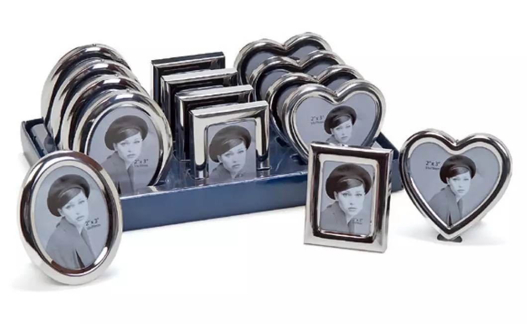Metalliset hopean väriset kehykset. Lajitelma neliö, sydän ja ovaalikehyksiä. Koko n. -sk: 4,5x6cm -soikea: korkeus n. 6cm -sydän: maksimi 5-6x6cm Telineessä 12 kpl lajitelma.... Lue lisää