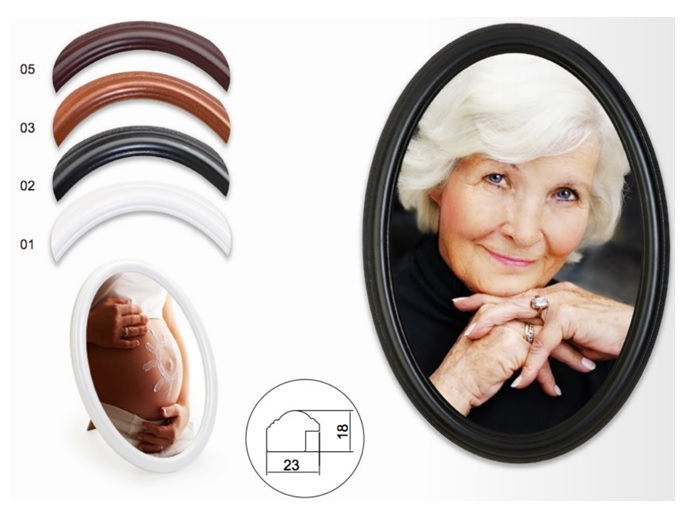 Puinen ovaalikehys - profiilin leveys n. 2,3cm Värit: - valkoinen (01) - musta (02) - vaaleanruskea (03) (tilaustuote) - tumma puu (05)
