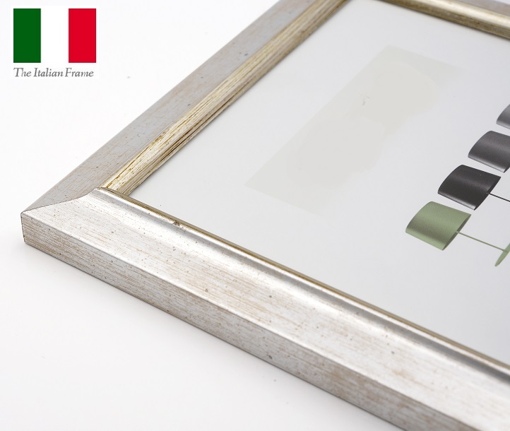 Tyylikäs italialainen puukehys. Listan leveys n. 2cm, korkeus 1,5cm Tyylikäs murrettu hopea.