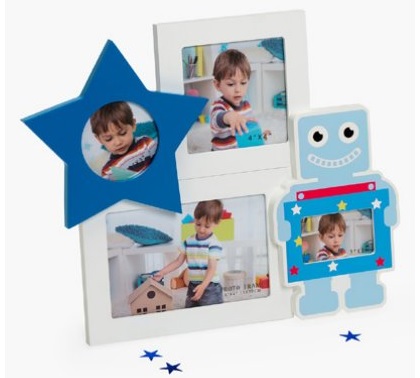 Hienosta viimeistelty puinen monikuvakehys lastenhuoneeseen.