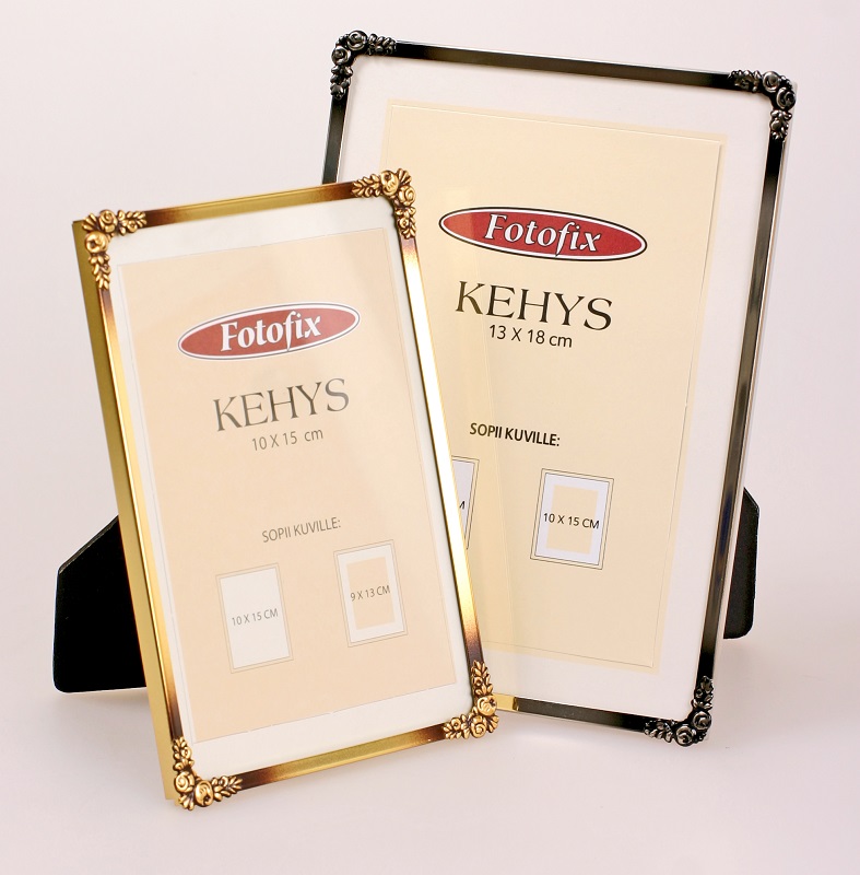Metallikehys ruusukulmalla. Hopean värinen Informatiivinen Paspartout-paperi (kuvakoko, aukko kuvakoko). Seistontuki pysty- vaakakuville. Taustakartonki piikkiripustusta varten. - Listan leveys noin... Lue lisää