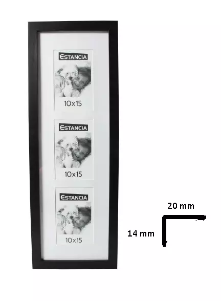 Puinen monikuvakehys leveällä aidolla paspartuurilla. Pysty ja vaaka ripustus. Profiili: 20x14 mm (leveys x korkeus) Kuvan koko: 10 x 15 cm Kehyskoko n: 20x60cm Väri: Musta Laatikossa 6 kpl... Lue lisää