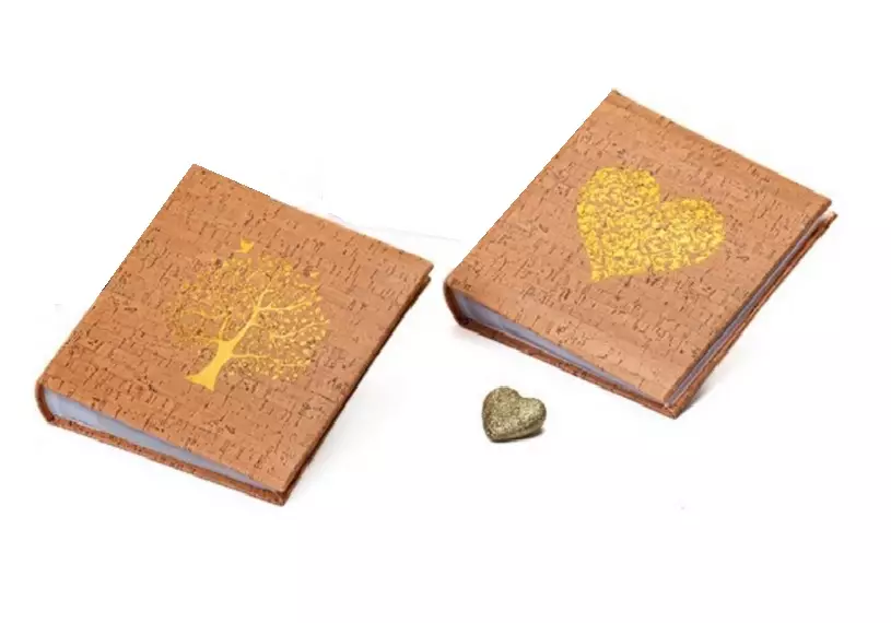 Korkkipintainen 200 kuvan taskualbumi kultafoliolla.