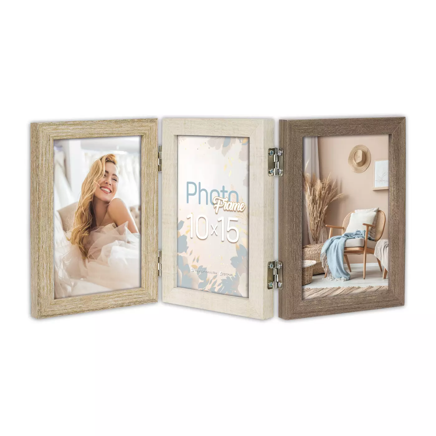 3n kuvan saranakehys luonnon sävyissä: vaalea, natural ja tumman ruskea. Metallisaranat helpottavat asettelua ja lisäävät kuvien näkyvyyttä. Kehyksen voi kätevästi taittaa pienemmäksi tai... Lue lisää