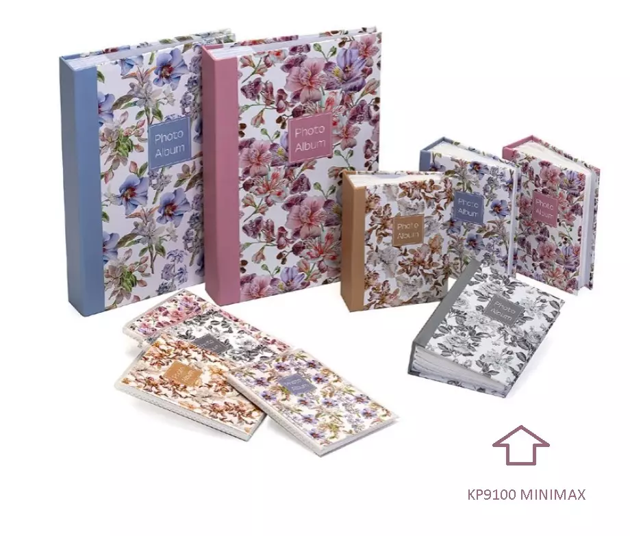 Kaunis kukka-aiheinen 100:n kuvan minimax taskualbumi 10x15 kuville. Yksivärinen selkä Valkoiset taskut Myydään vain lajitelmana, 12 / 24 kpl