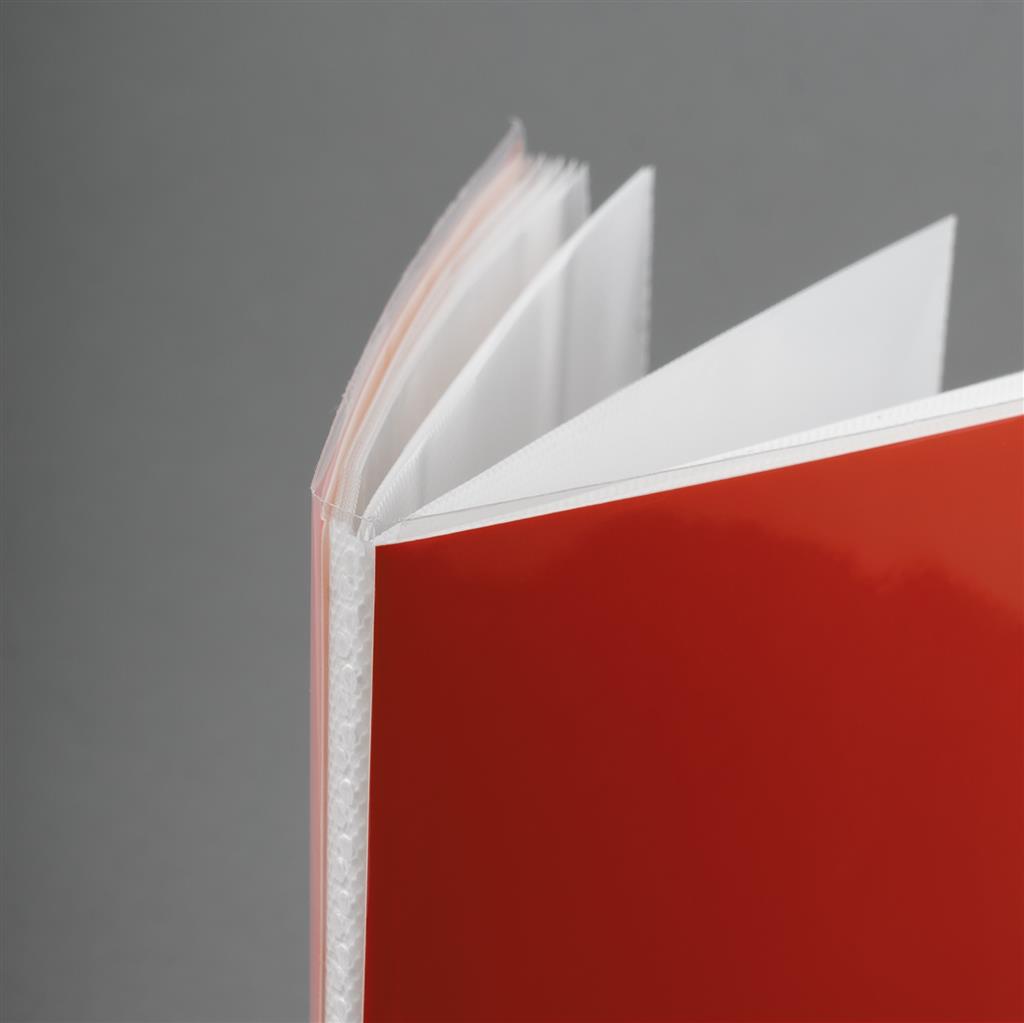 Yksivärinen pehmeä taskualbumi valkoisilla sivuilla.