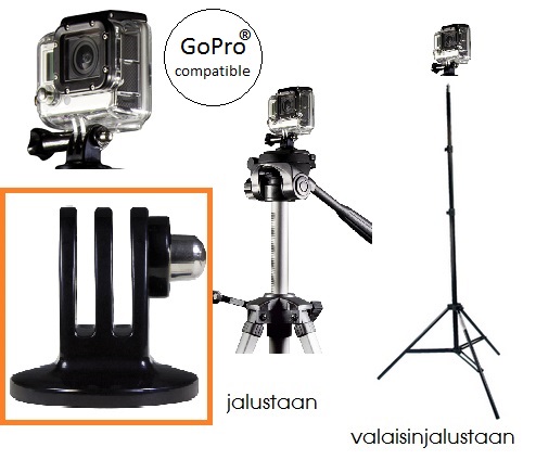 GoPro kameroille sovite. Sovitteen avulla saat GoPro kameran esim. - jalustaan - valaisinjalustaan. VALAISINJALUSTA esim.: - LS2000 valaisinjalusta, korkeus 228cm - L-3050 valaisinjalusta, korkeus... Lue lisää