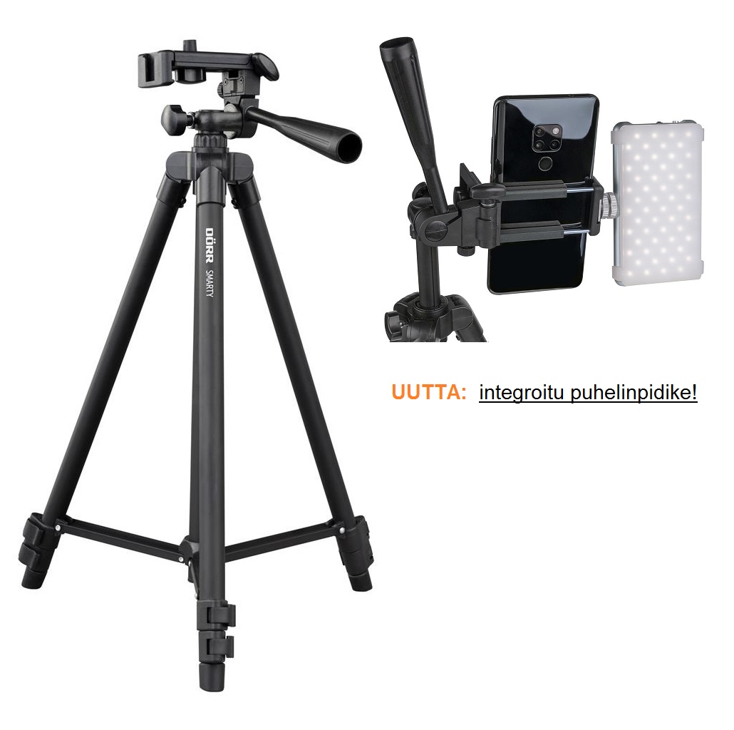 PUHELILN- KAMERA-JALUSTA "SMARTY" - alumiinirunko! DÖRR “Smarty” on erittäin kevyt ja kompakti alumiinijalusta, joka sopii täydellisesti älypuhelinten ja kompaktien kameroiden kanssa... Lue lisää
