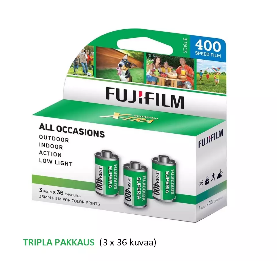 Fujifilm Fujicolor Superia X-TRA 400 värifilmi ISO 400 herkkyys, herkempi yleisfilmi sisälle ja ulos. - väri paperikuville - 135 mm kinokoko - 36 kuvalle - pakkauksessa 3 kpl rullia Valmistettu... Lue lisää