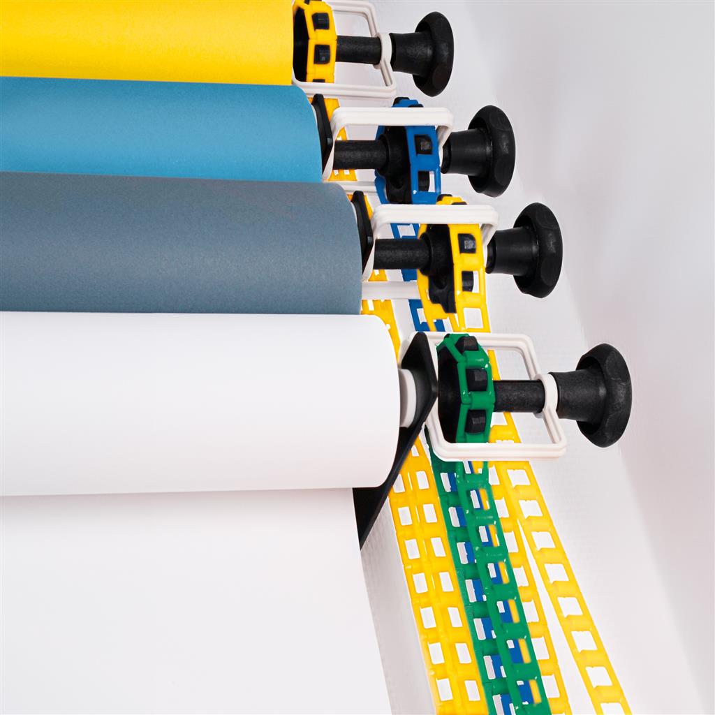 Rullateline seinään tai kattoon. Telineeseen menee 4 taustakartonkia.