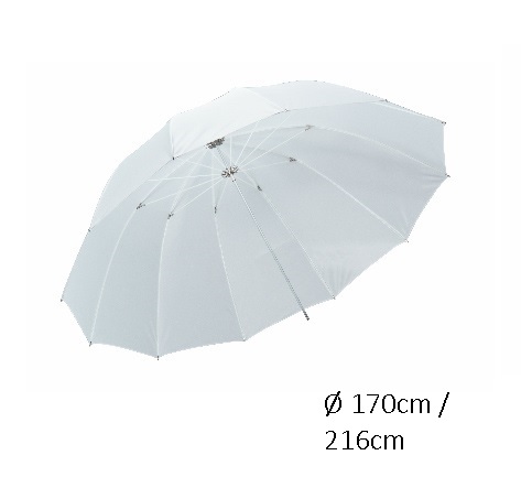 Suurikokoinen sateenvarjoheijastin. - valkoinen läpiammuttava - toimii myös heijastimena Koko: - Ø 170cm, - "kupoli mitta" 216cm, - pituus n. 95cm - metallitangon halkaisija 8mm Saa helposti kasaan... Lue lisää