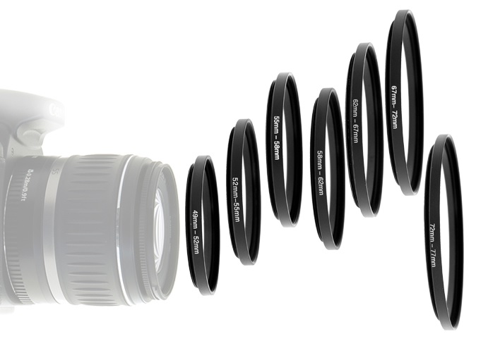 Metalliset Step-down soviterenkaat. Ensimmäinen numero kertoo objetiivin halkaisijan johon soviterengas kiinnitetään. Toinen numero kertoo suotimen tai lisätarvikkeen halkaisijan joka tulee... Lue lisää